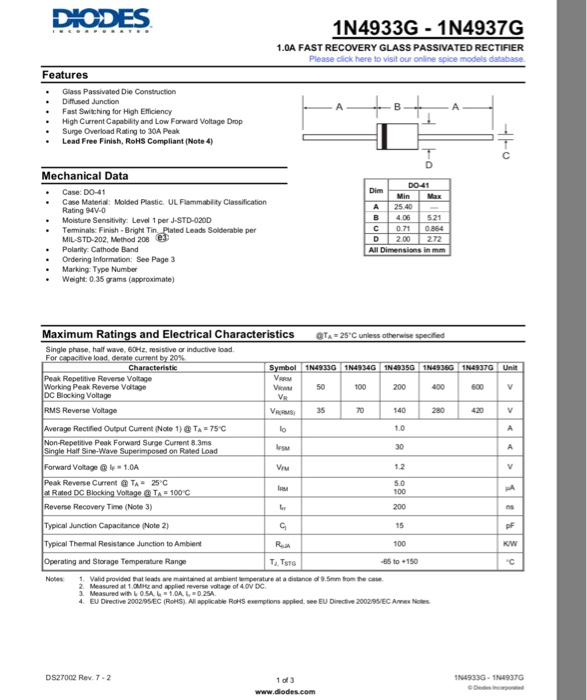 Диод 1N4936 представляет собой импульсный выпрямительный диод, предназначенный для применения в схемах с повышенными требованиями к быстродействию. Этот диод относится к семейству быстровосстанавливающихся диодов и обладает рядом важных характеристик: