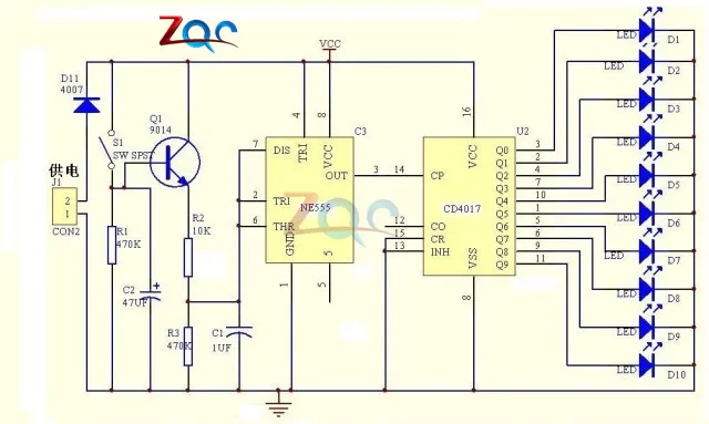 - Светодиодный секвенсор работает по принципу CD4017.