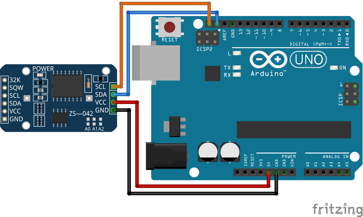 После настройки экрана по двум проводам, пришли RTC модуль — часы реального времени на микрухе 1307. Общаются они по тем же 2м проводам, то есть портов на ардуине не занимают вообще.