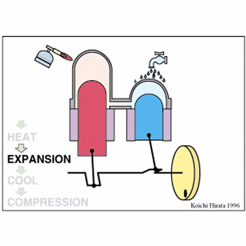Сам двигатель состоит из цилиндра, в котором движется вытеснитель и из второго цилиндра, в котором ходит рабочий поршень. Боковые стенки большого цилиндра не проводят тепло. Верхняя часть холодная, нижняя — горячая. Когда вытеснитель опускается вниз, перекрывая горячую пластину, воздух резко охлаждается и сжимается, втягивая рабочий поршень (зеленого цвета на видео).
