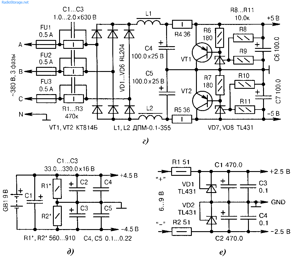 г) получение двухполярного стабилизированного напряжения от трёхфазной сети 380 В. Конденсаторы C1…СЗбалластные. Снижение пульсаций на входе осуществляется фильтрами L1, С4, L2, С5, а на выходе — конденсаторами С6, С7. Транзисторы VTI, VT2 применяются одинаковой проводимости, поскольку не существует трёхвыводных стабилитронов VD7, VD8 обратной, т.е. «отрицательной», полярности. Аналогичную схемотехнику можно использовать и в сети 220 В, подавая переменное напряжение с диодного моста прямо на катушки индуктивности L1, L2. Ёмкости всех электролитических конденсаторов фильтра придётся увеличить, поскольку в трёхфазном выпрямителе частота пульсаций выше;