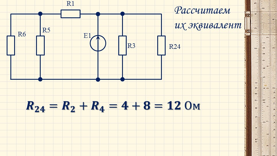 - Найдем эквивалентное сопротивление последовательной группы R1 и R2: R12 = R1 + R2 = 10 + 20 = 30 Ом