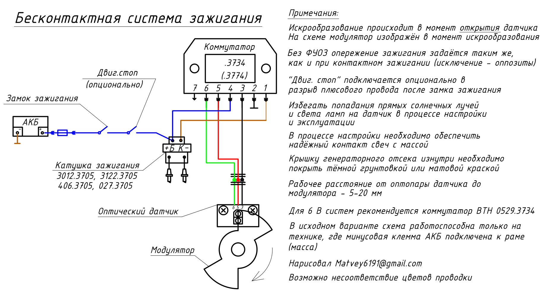 Схема подключения бесконтактной системы зажигания выглядит следующим образом: