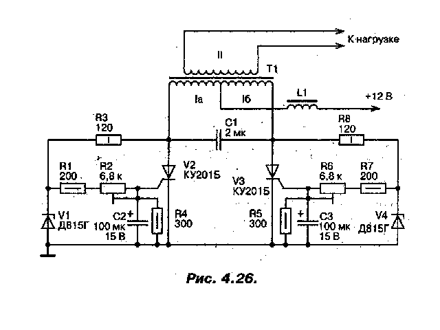 Каждый тиристор запускается импульсами от своего генератора на транзисторах Т3 и Т4. Частота следования импульсов зависит от времязадающих элементов R2-C3 — для верхнего плеча и R3-C4 – для нижнего.