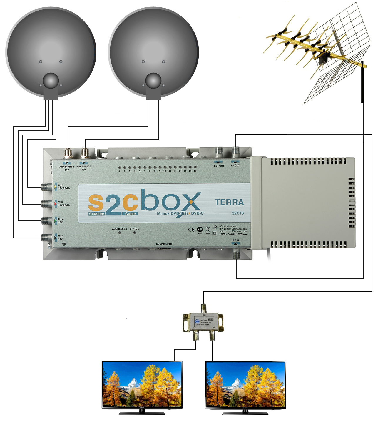 Головная станция PolySelect TST-1200 предназначена для раздачи спутниковых сигналов форматов DVB-S/S2 (SDTV/HDTV) по сетям кабельного телевидения (СКТ). Она конвертирует выбранные оператором цифровые пакеты (до 12 транспондеров с традиционной полосой 27 или 36 МГц) из первой спутниковой ПЧ (950-2150 МГц) в диапазон 250-730 МГц. На приемной стороне устанавливается абонентский или коллективный конвертер, преобразующий сигнал обратно в стандартный диапазон 1200-1680 (середина полного диапазона SAT ПЧ 950-2150 МГц) для приема стандартным спутниковым приемником.Станция имеет четыре входа, на которые подаются сигналы с четырехвыводного спутникового конвертера, принимаемые с одной спутниковой позиции, но в разных поляризациях и поддиапазонах или совершенно от разных SAT антенн. С помощью матричных коммутаторов эти сигналы передаются на входы канальных понижающих конвертеров (т.е. из SAT ПЧ (IF) диапазона в диапазон CATV).