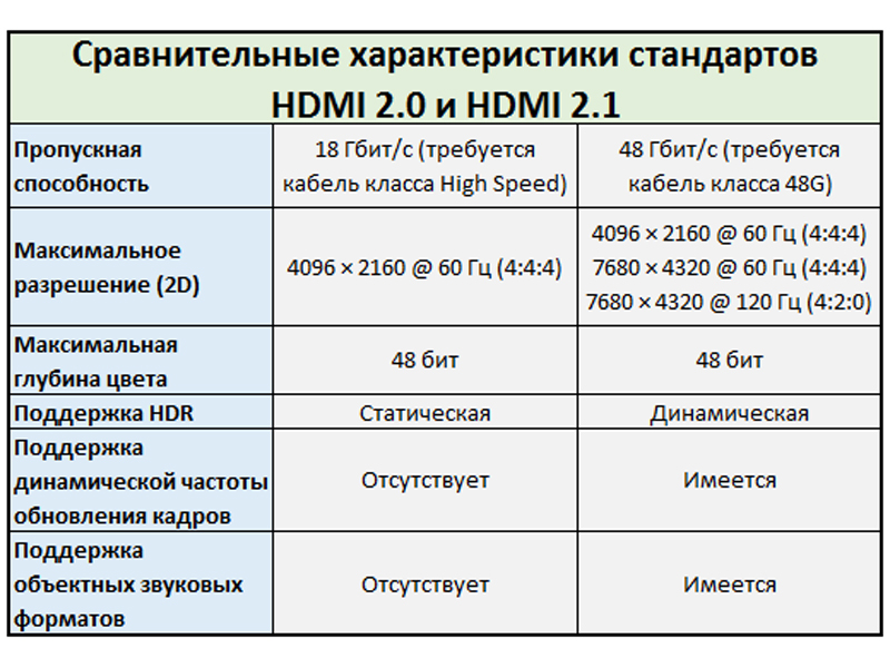 - Пропускная способность: 18 Гбит/с у HDMI 2.0 против 48 Гбит/с у HDMI 2.1