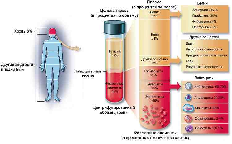 Π‘ΠΎΡΡΠ°Π² ΠΊΡΠΎΠ²ΠΈ — ΡΡΠΎ 60 % ΠΏΠ»Π°Π·ΠΌΡ ΠΈ 40 % ΡΠΎΡΠΌΠ΅Π½Π½ΡΡ ΡΠ»Π΅ΠΌΠ΅Π½ΡΠΎΠ².