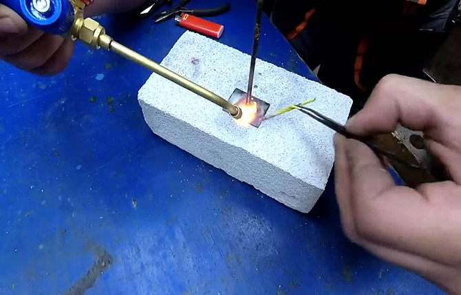- Нагрейте место соединения паяльником или горелкой до активации флюса
