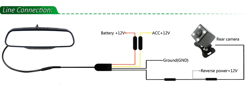 На зеркало и видеокамеру подаётся питающее напряжение. В зависимости от вида камеры тут возможно несколько схем подключения. Существуют камеры с разным количеством выводов — от 3 до 6. На приведенной выше схеме используется отдельный управляющий провод, который подсоединяется к питанию заднего света. В этом случае основной питающий вход камеры может подключаться напрямую к бортовой сети.