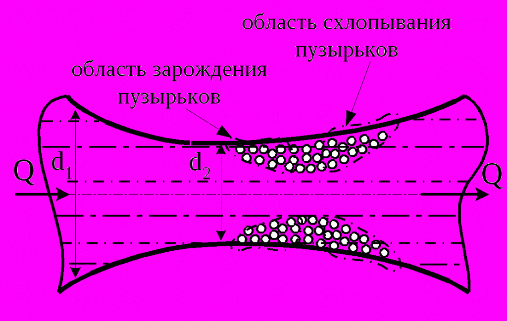 . В точках потока жидкости, в которых давление падает до этого значения, происходит нарушение сплошности течения, то есть срыв пограничного слоя, и образуется область, заполнения парами жидкости и газами, выделившимися из раствора. Это явление в гидродинамике называется кавитацией [7].
