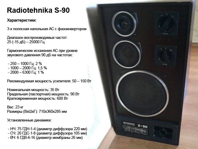 Если брать в пример обычные S90, то в них установлены динамические головки прямого излучения. Точнее, высокочастотная головка 10ГД-35, среднечастотная головка 15ГД-11А и низкочастотная головка 30ГД-2 (в более поздних моделях – 75ГДН-1-4).