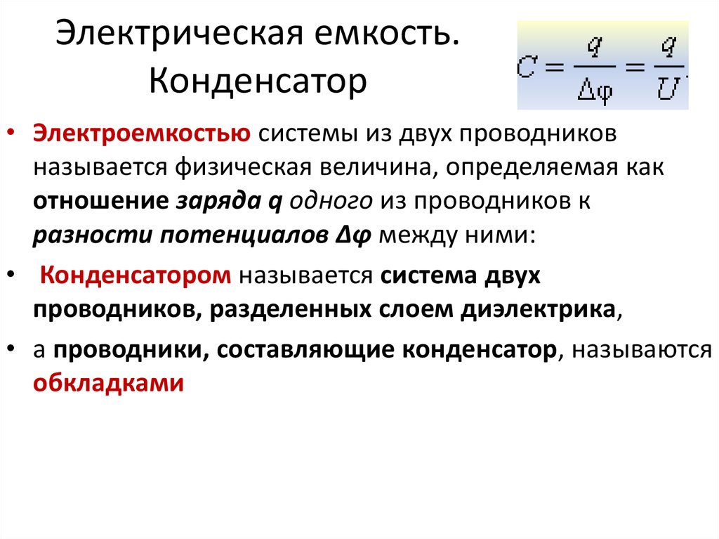 Слово «конденсатор» произошло от латинского «condensatio» — «накопление». Научное определение гласит, что накопительный электрический прибор — это двухполюсник, характеризующийся постоянным и переменным значениями ёмкости и большим сопротивлением. Предназначен он для накопления энергии и заряда. За единицу измерения ёмкости принят фарад (F).