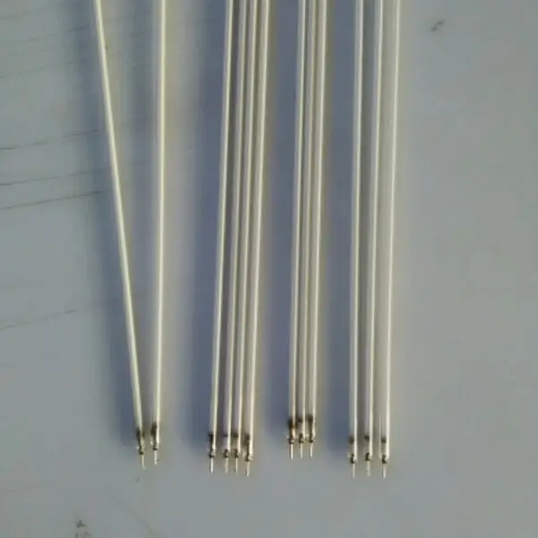К лампе подходят два провода, к горячему концу — толстый и короткий провод, к холодному концу – длинный и тонкий.