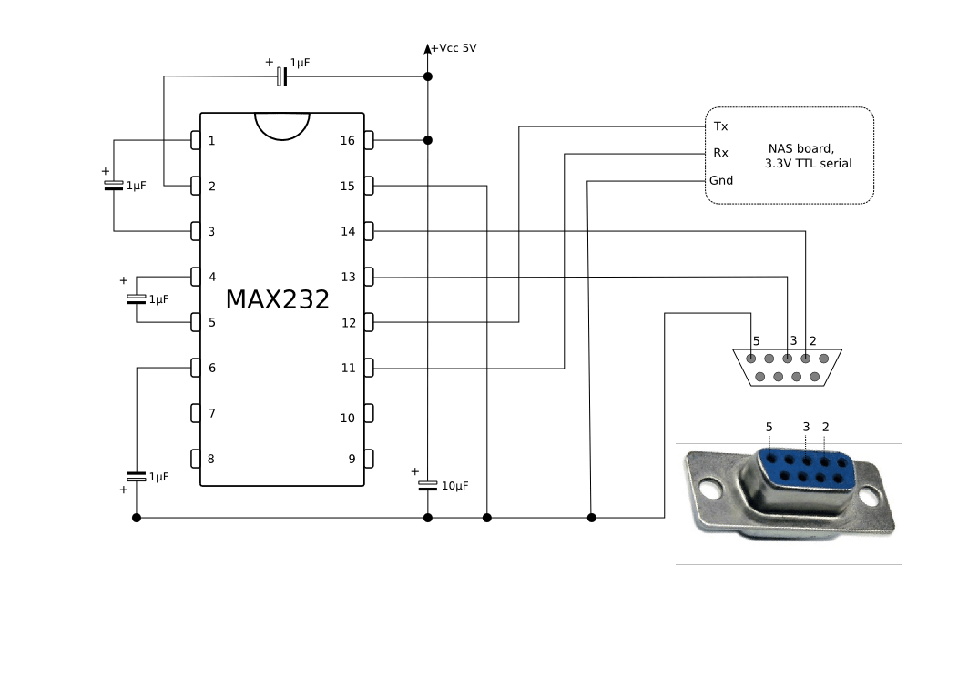 Для работы MAX232A требуется минимум внешних компонентов. Типовая схема включения выглядит следующим образом: