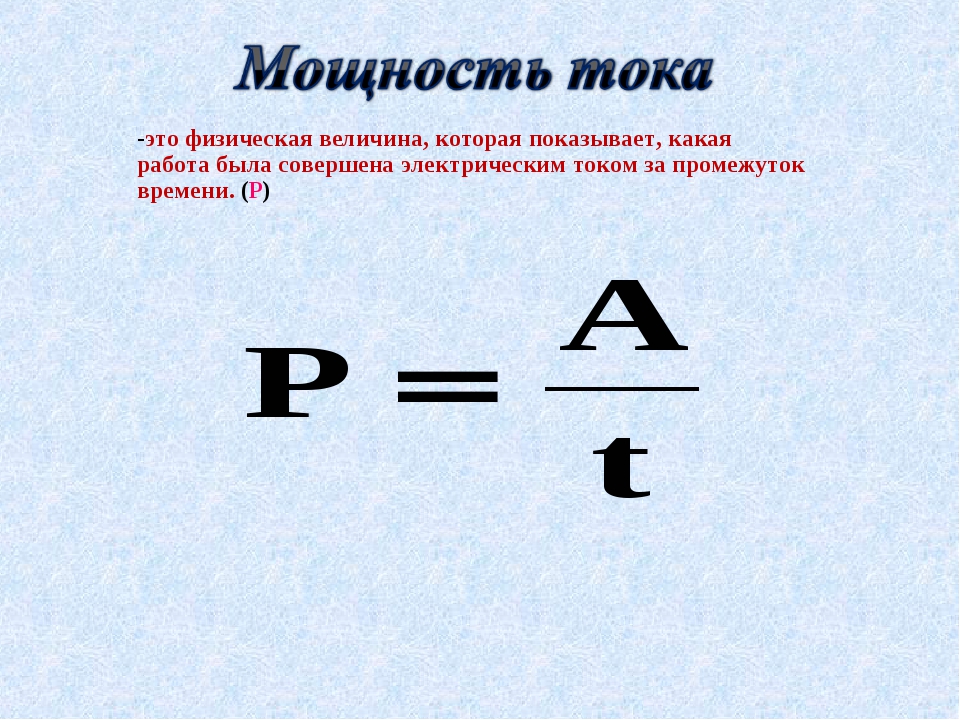 - P = A / t — Π³Π΄Π΅ A — ΡΠ°Π±ΠΎΡΠ° ΡΠΎΠΊΠ°, t — Π²ΡΠ΅ΠΌΡ
