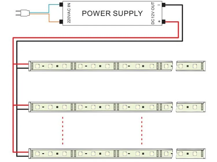 При необходимости установки более длинных светодиодных лент рекомендуется, чтобы каждые 5 метров лент подключались к источнику питания параллельно.