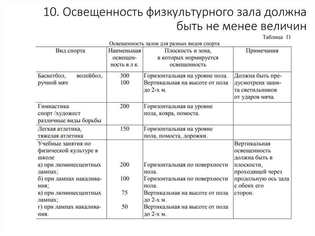 - Спортивные залы — 200-300 лк
