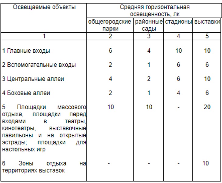 № | Освещаемые объекты | Средняя освещенность (Еср), лк не менее |