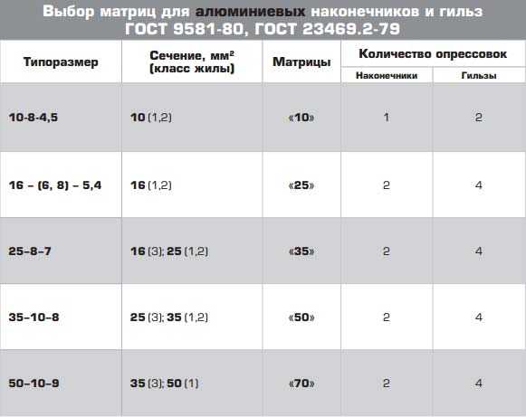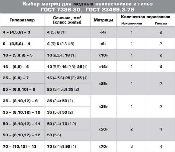 В инструкции по эксплуатации пресса, которая идет в комплекте с инструментом есть табличка, где указывается требуемое количество обжимов, Учтите один момент, что данная таблица предназначена для наконечников и гильз сделанных по ГОСТ. Чем они отличаются от других марок можно узнать в статье Кабельные наконечники маркировка и виды.