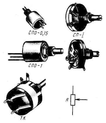 В бытовой аппаратуре часто применяют переменные резисторы, объединенные с одним или двумя выключателями. Символы их контактов размещают на схемах рядом с условным графическим изображением переменного резистора и соединяют штриховой линией с жирной точкой, которую изображают с той стороны УГО, при перемещении к которой движок воздействует на выключатель, (рис.