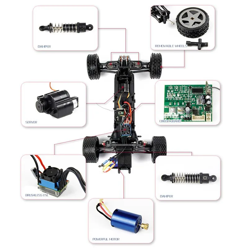 Радиоуправляемая машинка (RC-модель) — это миниатюрный автомобиль, которым можно управлять дистанционно с помощью пульта. Главные компоненты такой игрушки: