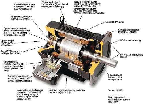 За преобразование электричества в механический поворот в сервоприводе отвечает электромотор. В асинхронных сервоприводах установлен коллекторный мотор, а в синхронных — бесколлекторный.