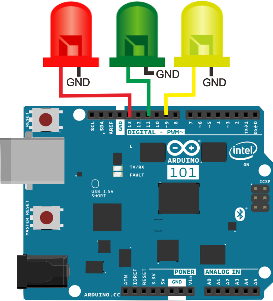 - Короткая ножка светодиода (катод) подключается к GND на Arduino