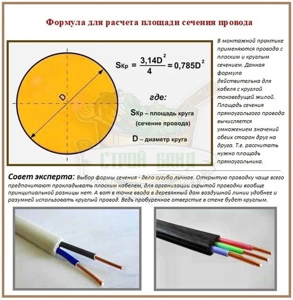 - При вычислении площади квадратной единицы для круглого провода используется формула площади круга: