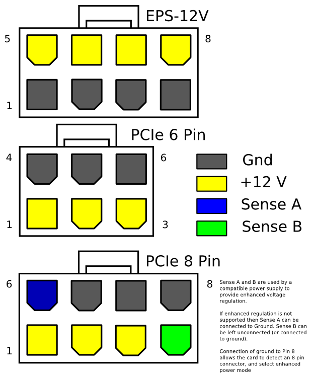 Современные мощные видеокарты PCI Express часто требуют дополнительного питания через 6- или 8-контактный разъем. Его распиновка: