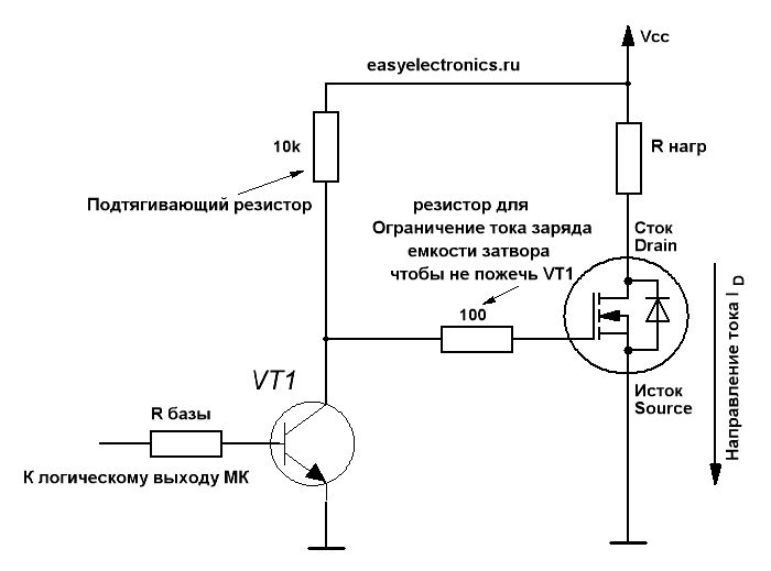 При реализации схемы ключа на полевом транзисторе необходимо учитывать некоторые особенности: