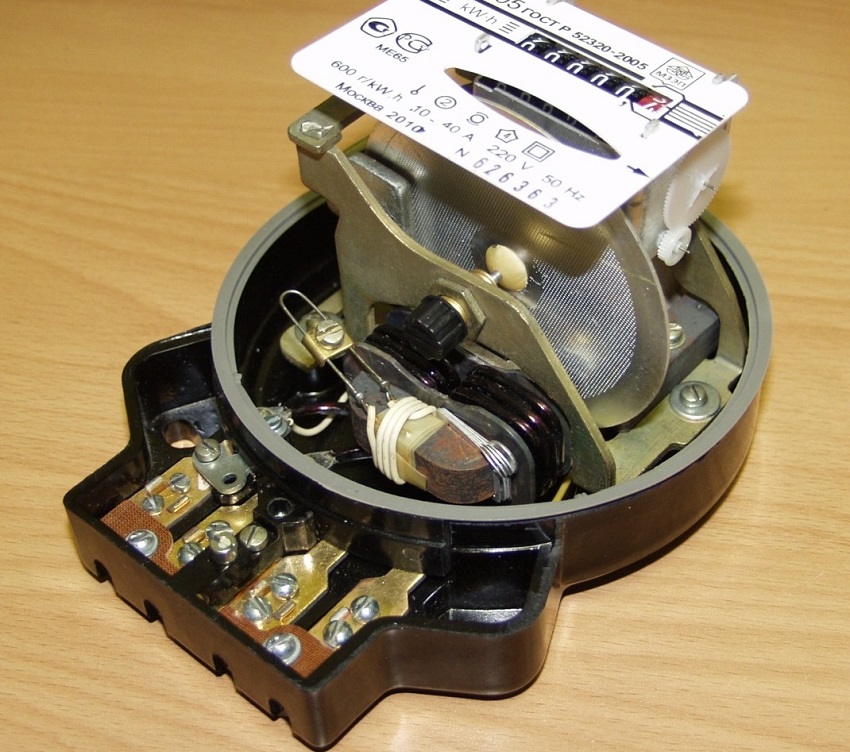 Принцип работы основан на вращении алюминиевого диска под воздействием магнитного поля. Скорость вращения диска пропорциональна потребляемой мощности. Число оборотов подсчитывается механическим счетным механизмом.