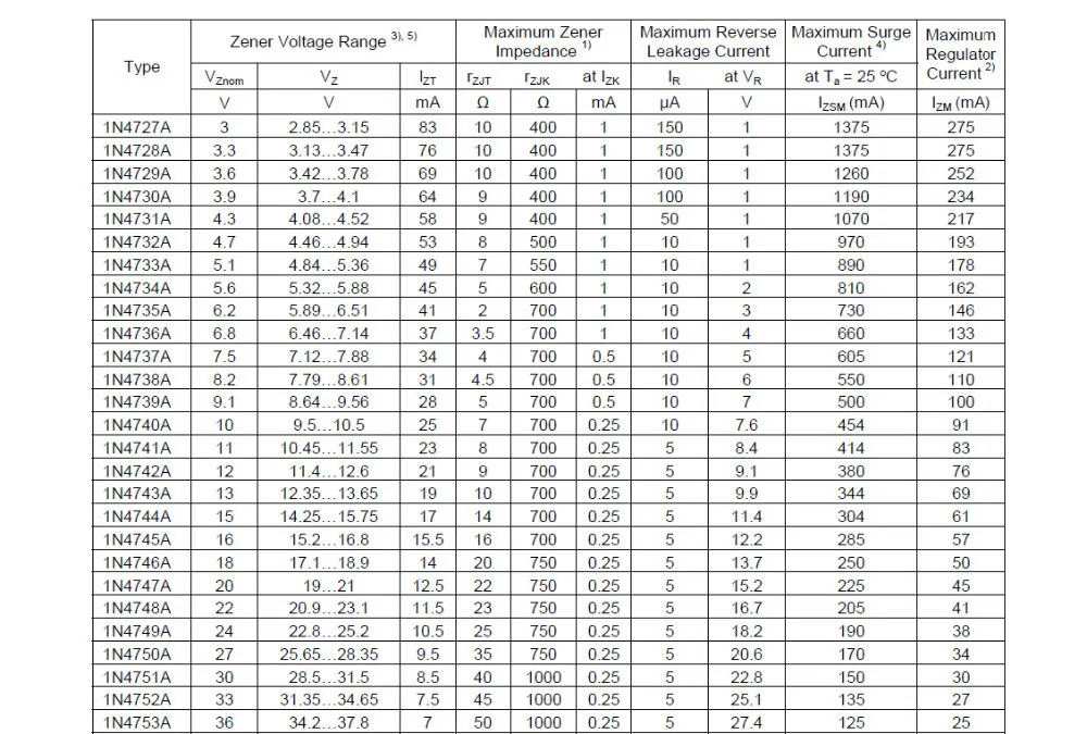 - Технические характеристики стабилитронов серии 1N47, справочник