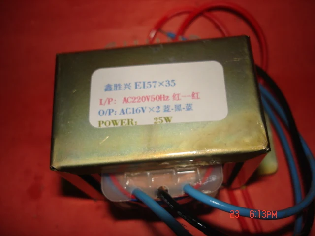 На трансформаторе не был обозначен его тип, но зато была написана его мощность (110 Вт) и выходные напряжения 2×12 В и 11 В. Правда, выходные токи указаны почему-то не были. Глядя на диаметр проводов, становится понятно, что обмотка с напряжением 11В явно маломощная и рассчитана на ток никак не более чем 0,2…0,3А. Следовательно, ее вкладом в выходную мощность трансформатора можно пренебречь.