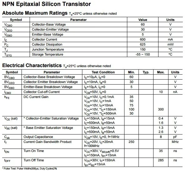 Все технические характеристики на транзистор 2N2222 всегда указывают в своих datasheet производители устройства. Ниже мы приведём все основные параметры которые обязательны для ознакомления перед его использованием.