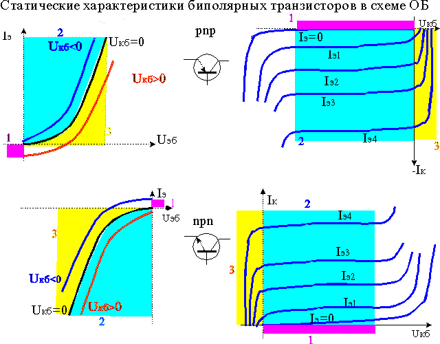 Выходные характеристики показывают зависимость выходного тока от выходного напряжения при фиксированном входном токе. Рассмотрим их для схем ОБ и ОЭ.