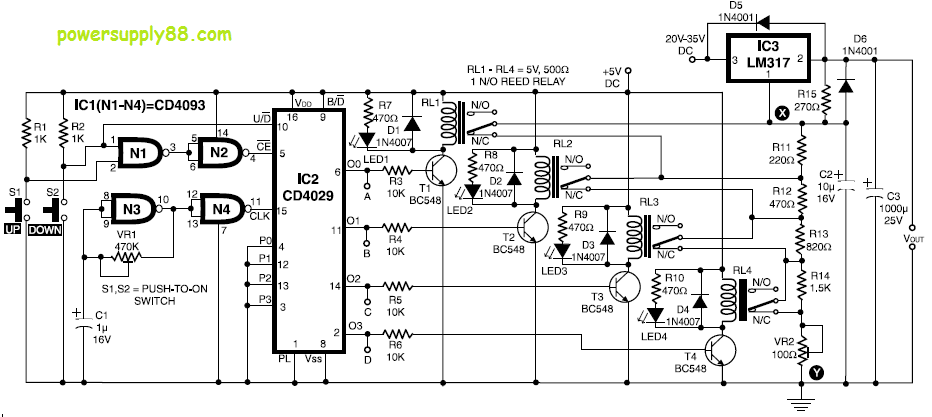 На входе блока питания установлен диодный мост VD1-VD4, выпрямляющий сетевое напряжение 220В. Сглаживание пульсаций обеспечивает конденсатор большой емкости C1 (470 мкФ).
