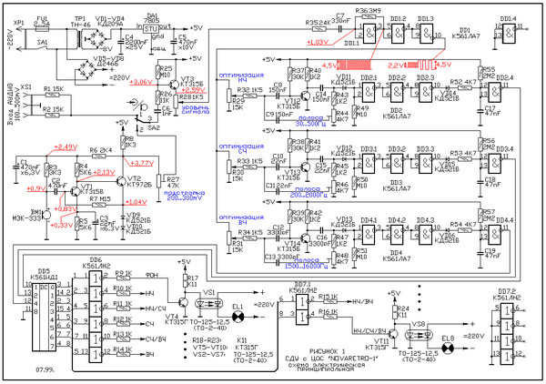 Обмен опытом: Необходимо заэкранировать трансформатор Т1 на входе audio. На плате есть обозначения, увеличте рисунок. Имеется ошибка в номиналах кондинсаторов С1-С4 вместо номиналов 1 мкф, необходимо поставить 0,1 мкф Мощность ламп цветомузыкальной приставки, ограничивается мощностью выходных каскадов усилительного устройства. Получить сравнительно большую мощность усилителя на транзисторах, довольно сложно. Вот почему на выходе усилительных каскадов цветомузыки на фонарях установлены тиристоры, способные управлять нагрузкой мощностью в несколько сотен ватт и более. Именно такой принцип реализован в данной цветомузыке. В цветомузыкальной приставке 3 канала цвета. Первый канал собран на транзисторах VT1 и VT2.Сигнал на вход канала поступает с движка переменного резистора R1 включенного во вторичную обмотку развязывающего трансформатора T1. Поскольку этот канал должен выделять низшие частоты, на входе его стоит фильтр R5,C1, ослабляющий средние и высшие частоты. За этим фильтром следует так называемый активный фильтр, собранный на транзисторе VT1. Он настроен на пропускание полосы частот примерно от 100 до 800 Гц. Это зависит от емкости конденсаторов C3 и C4 в цепи обратной связи между коллекторной и базовой цепям.Уровень обратной связи, а значит, и степень выделения заданных частот можно регулировать подстроечным резистором R9. С выхода фильтра сигнал подается через диод VD1 и резистор R10 на базу транзистора VT2. Транзистор открывается, и в цепи его эмиттера начинает протекать ток. В результате открывается и тиристор VS1, в анодную цепь которого включена лампа накаливания EL1, окрашенная в красный цвет. Сигнал на второй канал, собранный на транзисторах VT3, VT4,поступает с движка переменного резистора R2. На входе канала стоит разделительный конденсатор С5, пропускающий сигналы средних и высших частот. Далее следует активный фильтр на транзисторе VT3,настроенный только на средние частоты (от 500 до 2000 Гц), управляющий каскад на транзисторе VT4 и тринистор VS2, включающий лампу EL2 зеленого цвета. С движка переменного резистора R3 сигнал подается на третий канал, собранный на транзисторах VT5, VT6. Этот канал реагирует только на сигналы высших частот (от1500 до 5000 Гц) и с помощью тринистора VS3 управляет лампой EL3синего цвета. Осветительные лампы и тиристоры подключены к другому двухполупериодному выпрямителю на диодах VD10-VD13. Но здесь фильтрующие элементы отсутствуют, что необходимо для нормальной работы тиристоров – они ведь включаются при определённом напряжении между управляющим электродом и катодом, а выключаются только при падении напряжения между анодом и катодом до нуля.