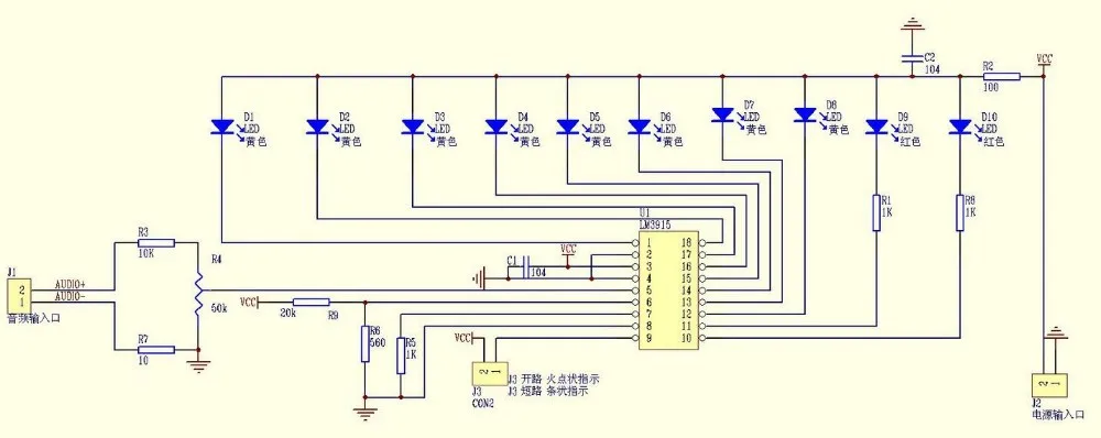 Как сделать чтобы светод загорался от меньшего уровня сигнала? При максимуме громкости загораются 7 светодиодов и все. Добрый день! Где-то ошибка , проверьте на 7 раз все, если собрали по схеме все должно работать, проверьте по схеме, а также все номиналы, проверьте правильно ли вставили микросхему в сокету.