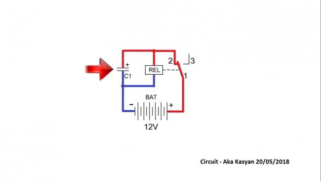 Наша первая схема построена на основе реле и электролитического конденсатора.