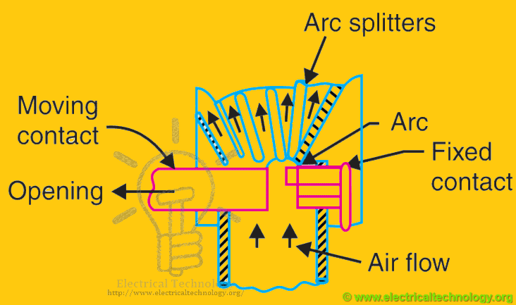 Автоматический выключатель снабжен камерой, окружающей контакт.Камера известна как «дугогасительная камера». Дуга заставляет его вбивать. Дугогасительная камера поможет добиться охлаждения. Arc Желоб сделан из некоторого огнеупорного материала. Внутренние стенки дугогасительной камеры имеют такую форму, что дуга не только нагнетается в непосредственной близости, но и проникает в змеевидный канал, выступающий на стенке дугогасительной камеры.