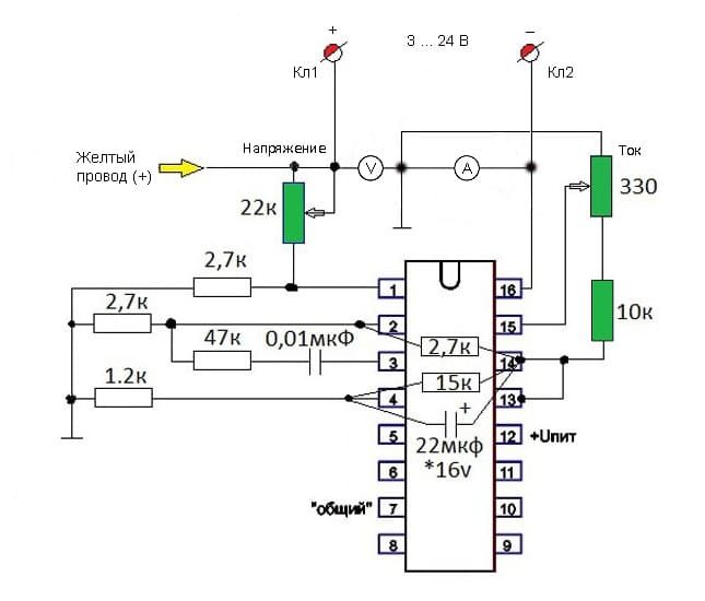 Скользящая клемма подключается к контакту 1 регулятора IC. Правая клемма потенциометра (желтый кабель) подключена к выходу +12 вольт. Резистор 3300 Ом на этой картинке не подключен, т.к. он мне не понадобился.