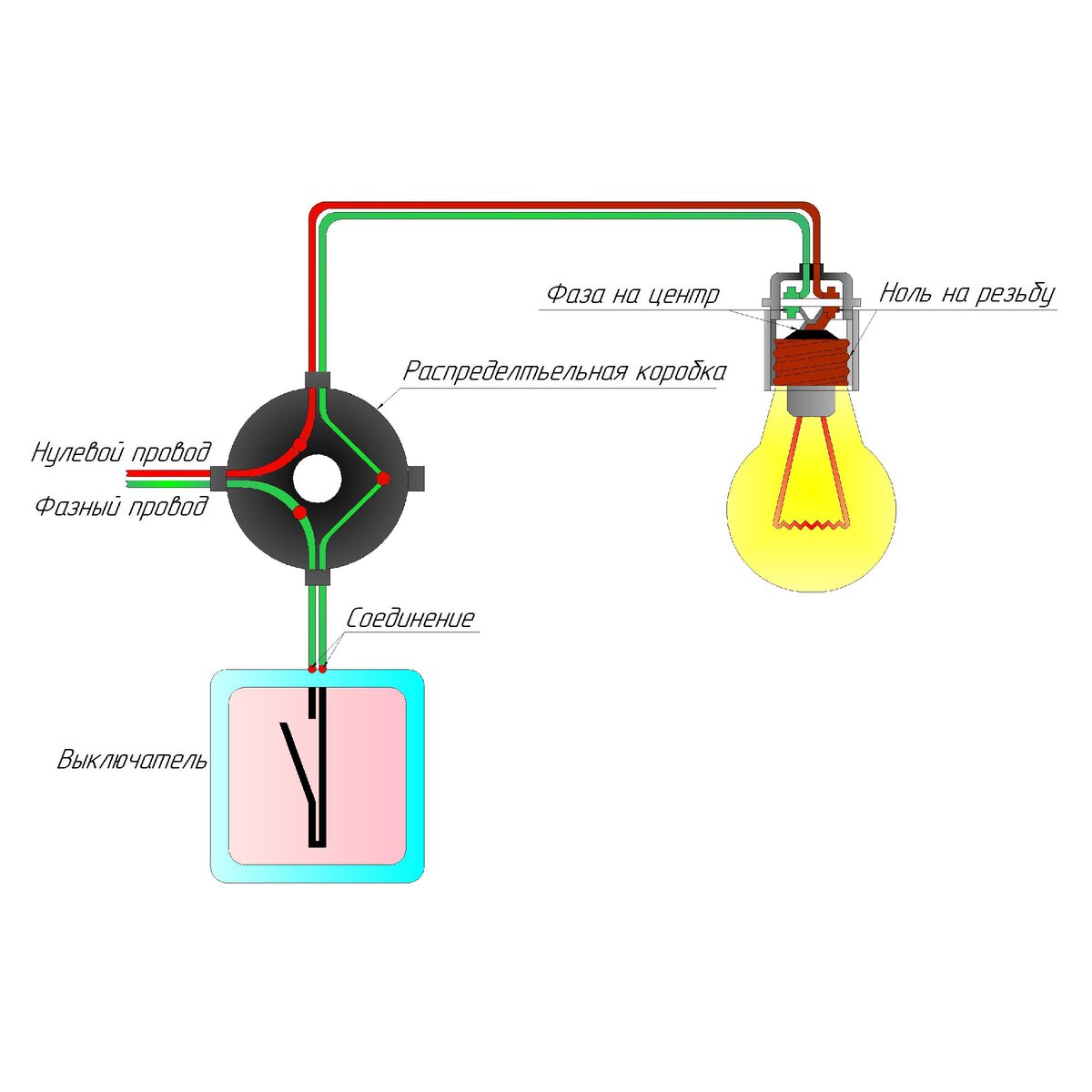 Ноль к лампочке приходит напрямую с питающего провода, а фаза делается в разрыв. Разрывать ее будет выключатель, при нажатии кнопки включения он замкнет цепь и подаст фазу к лампочке, при выключении разомкнет и фаза пропадет. При подключении самой люстры учтите, что на резьбу подаётся ноль, а на цоколь — фаза. Очень часто их путают, подключая патрон «как придётся».