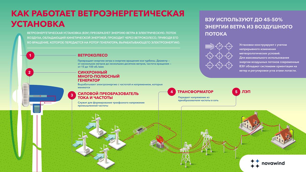 Как устроен и работает ветрогенератор. Из каких основных частей состоит ветряная турбина. По какому принципу ветряк преобразует энергию ветра в электричество. Какие бывают схемы работы ветрогенераторов.