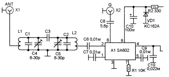 УРЧ трансивера собран на полевом транзисторе VT1. Регулировка усиления РЧ осуществляется переменным резистором R1, изменяющим напряжение смещения на втором затворе транзистора.