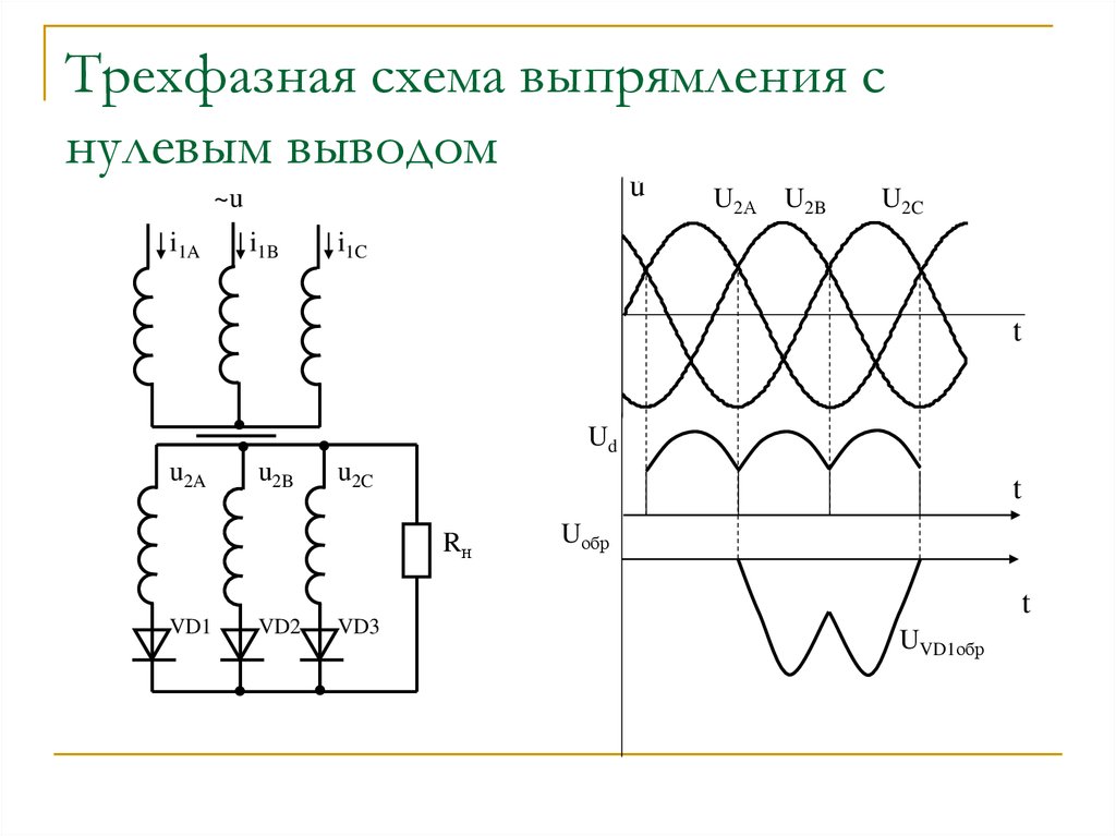 - Многофазное переменное напряжении при выпрямлении дает более «гладкую» форму постоянного напряжения (меньшее напряжение пульсаций) по сравнению с выпрямленным однофазным напряжением.