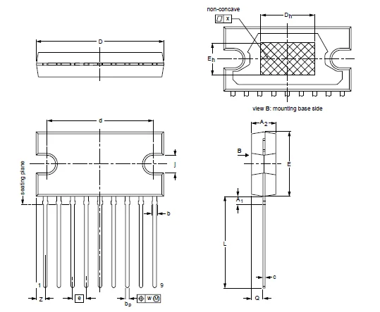 Микросхема выполнена в пластмассовом 9-выводном корпусе типа SOT131A,имеющем размеры 12,0х23,7 мм (шаг выводов 2,54 мм), что позволяет без труда разместить все элементы схемы (без радиатора и блока питания) на печатной плате размером 80х25 мм. Как видно из рис.1, транзисторы выходного каскада имеют две системы защиты от перегрева и от перегрузок по току. В таблице приведены характеристики, заявляемые изготовителем.