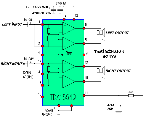 TDA1554Q представляет собой четырехъядерную несимметричную схему подключения приложения