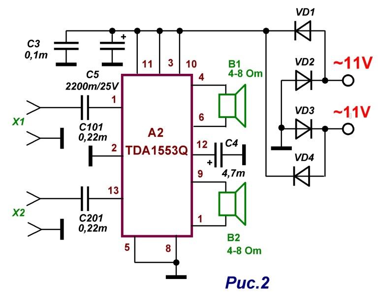 То есть при подключении динамиков 6-земля и 12-земля, мы получаем двухканальный усилитель с мощностью уже 11 Вт.