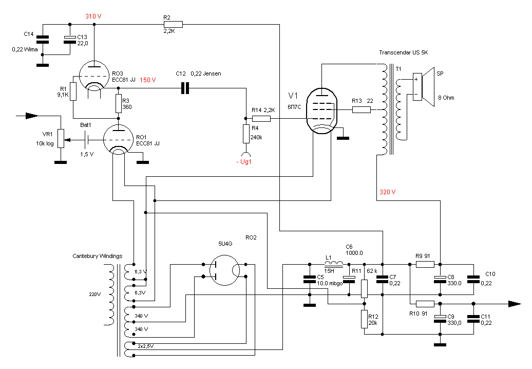 - Для раскачки выходного каскада используется фазоинвертор на двойном триоде 6Н9С или 6Н8С