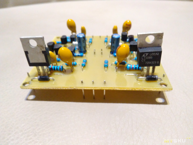 Использовал такие детали. Стабилизатор: вместо LM317 установил LT1085. С ними звук больше понравился. Все полярные конденсаторы — тантал Kemet (кроме конденсатора С3 на 47 мкФ — не было тантала такой емкости в наличие — установил Nichichon for Audio). С2 510 пФ — полипропиленовый конденсатор (на ебее ищутся по словам Polypropylene и Styroflex). РГ — переменный резистор ALPS в 10 кОм. РГ стоял по-началу на 50 кОм — от него был достаточно слышимый даже на средней громкости фон. Заменил на ALPS 10 кОм — все ок стало. Фон слышно только на макс громкости. Два канала соединены вместе только на входных гнездах. В остальном два полностью независимых канала со своими блоками питания.